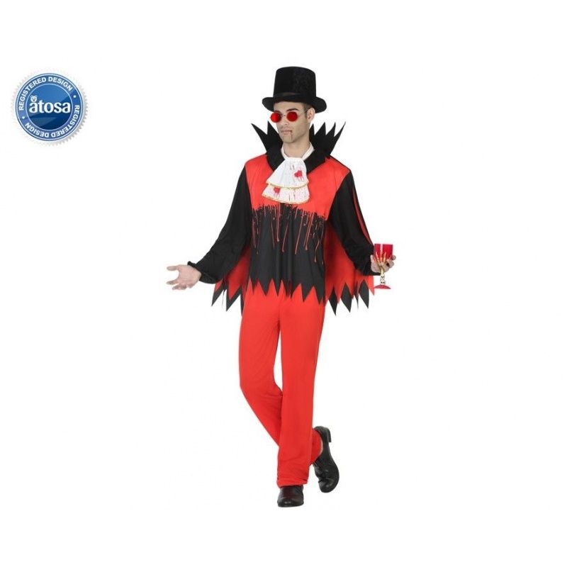 Disfraz para hombre de vampiro. Contiene camisa con capa, pantalón y chorrera del cuello. Elegante disfraz de vampiro sangriento, para tus noches de terror.